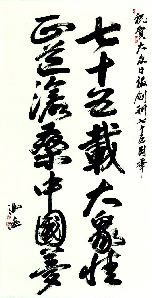 2014年1月1日,大众日报迎来了75周年华诞,由大众报业集团投资建设的大众传媒大厦也在此时顺利落成。在这双喜临门的日子里,由大众报业集团主办、山东新闻书画院承办的“全国名家书画作品展”历经数月的征集和筹备,1月26日将在大众传媒大厦内的山东新闻美术馆隆重举办,来自全国24个省(自治区、直辖市)116位著名书画家创作的118幅庆贺作品,格调高远、异彩纷呈,代表了当今中国书画的较高水平,也送上了广大书画家对大众报业集团的深情祝福。