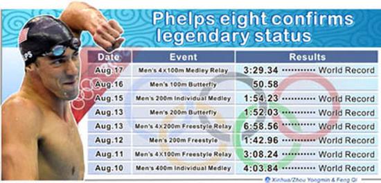 他们都为奥运成就设置了惊人乃至荒唐的高标准:因为菲尔普斯的8金伟业,人们会觉得他单届6金2铜、5金1 银、4金2银这样的表现都只能算是“还可以”;因为博尔特的“无敌”和不断刷新人类极限,当他没能打破世界纪录时,人们甚至会“有点失望”。菲鱼单届8 金、奥运23枚金牌和28枚奖牌的纪录几乎是不可逾越的,而“闪电”则在奥运会7战全胜,如果能连续三届包揽奥运三金,那么他已经震古烁今的成就无疑还会更为不可思议。多到数不过来的金牌和强到没有对手的寂寞,是飞鱼和飞人给世界的印象。