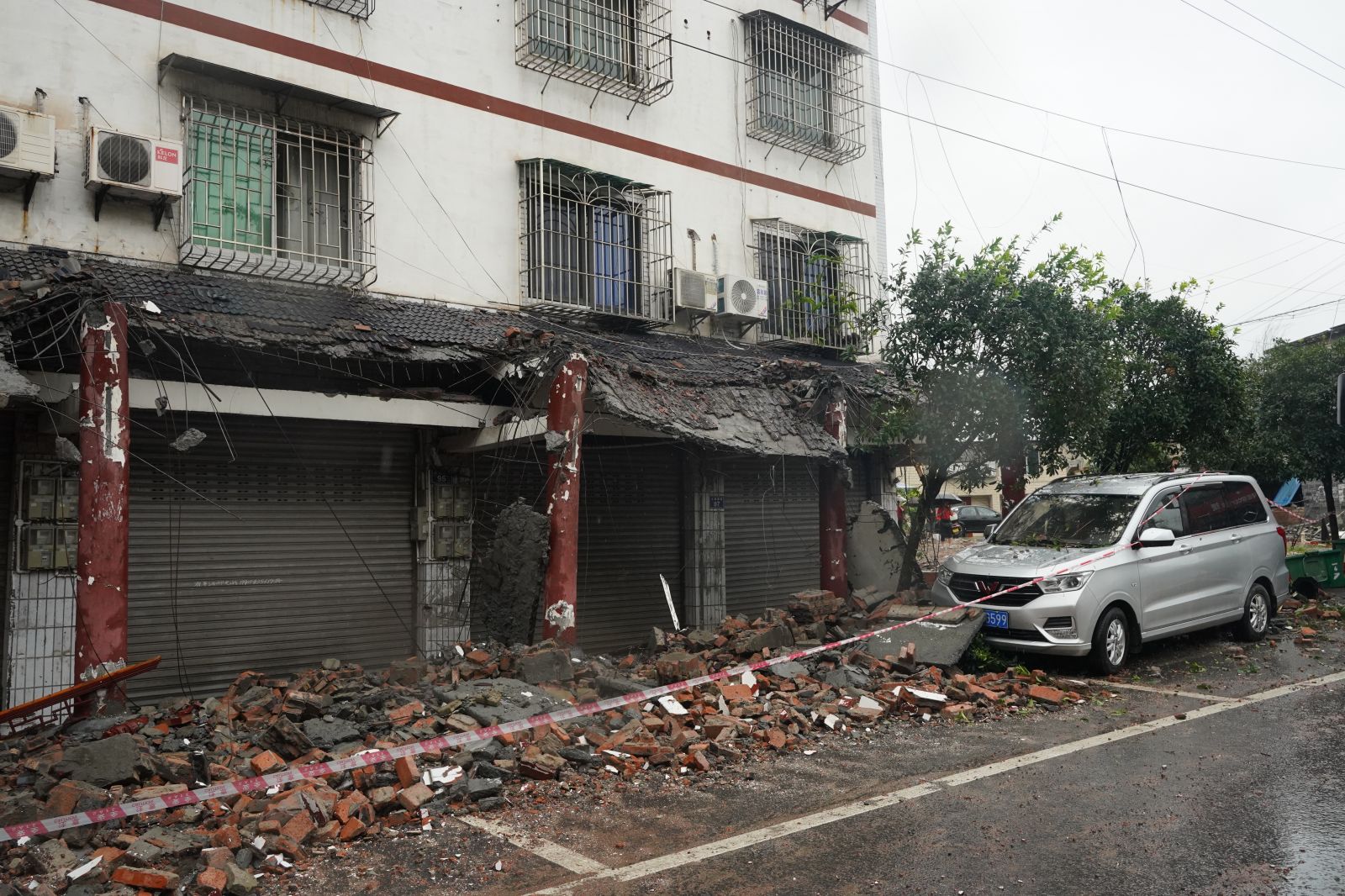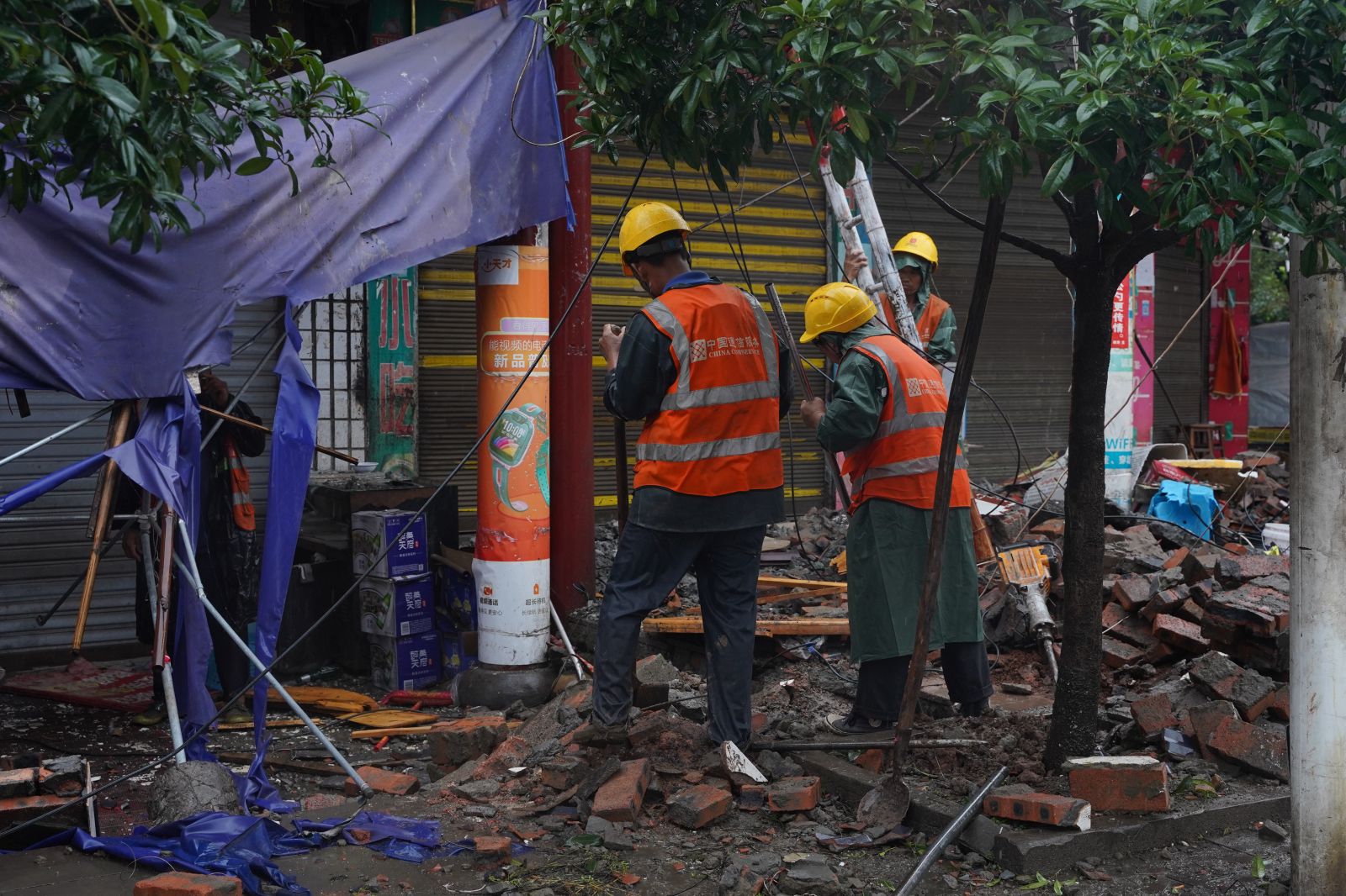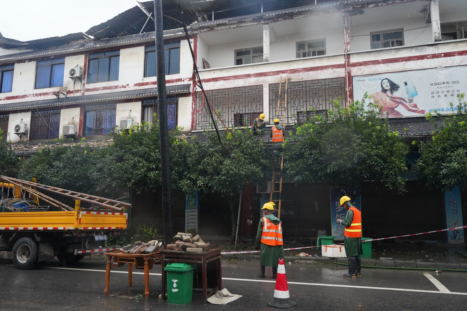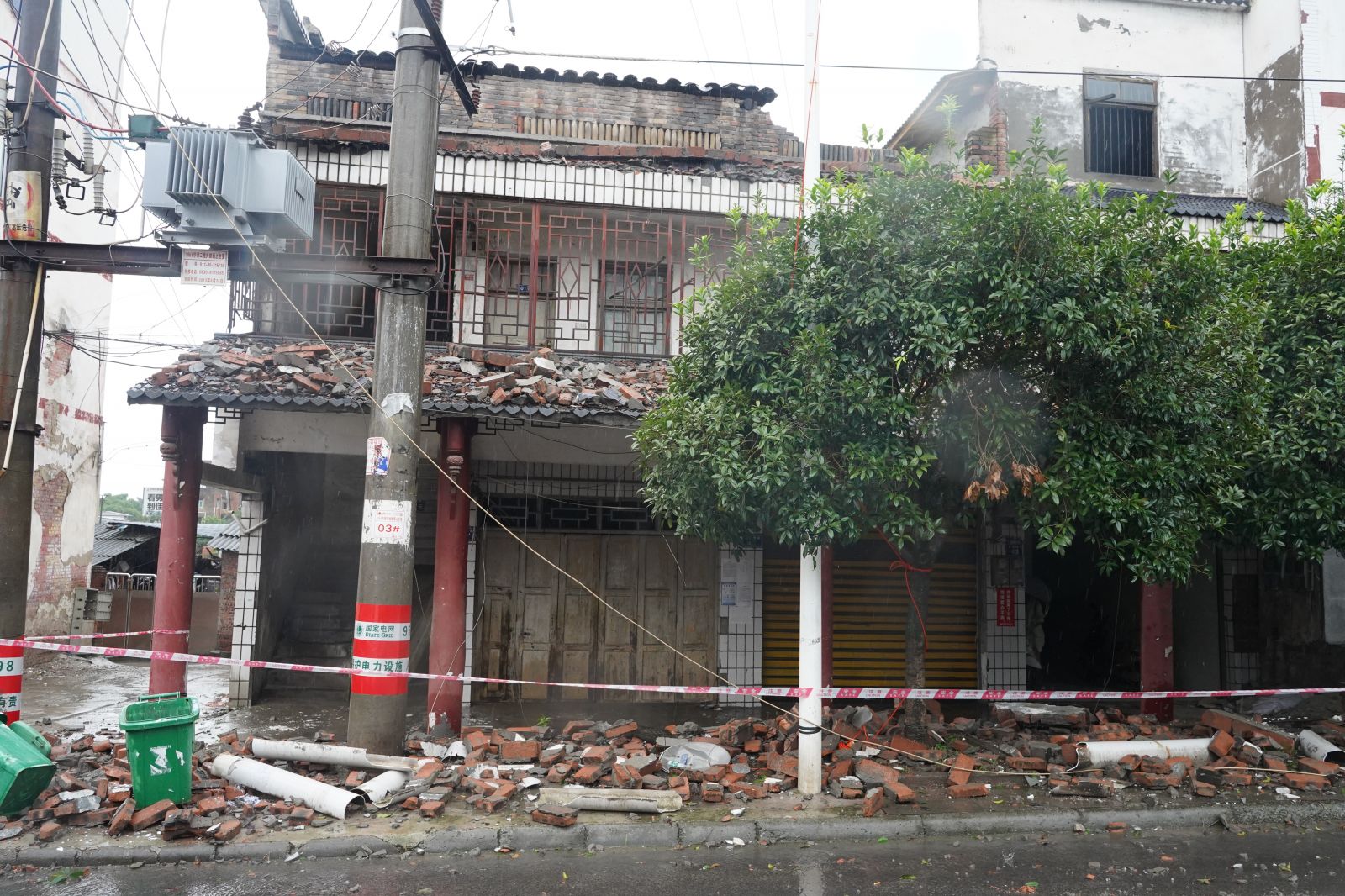 大众网·海报新闻记者在福集镇多条街区看到,街边房屋部分受损严重,垮塌下的砖块与瓷砖散落在街边,当地电力工人正在抢救电力设施。
