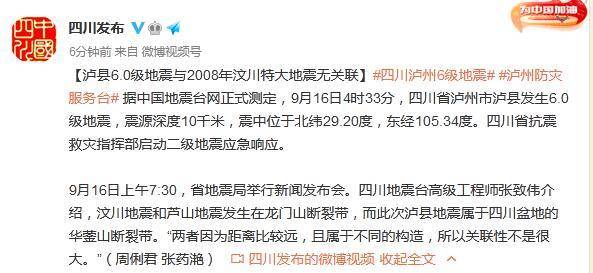 中新网9月16日电 据四川省人民政府新闻办公室官方微博消息,据中国地震台网正式测定,9月16日4时33分,四川省泸州市泸县发生6.0级地震,震源深度10千米,震中位于北纬29.20度,东经105.34度。四川省抗震救灾指挥部启动二级地震应急响应。