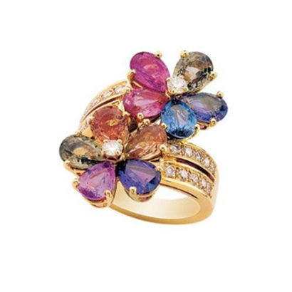 Bulgari蓝宝石花黄金戒指108100元,镶满钻石的宝石,在热闹的金黄色中称托得格外夺目――其中有:彩色蓝宝石(8.3克拉)、钻石(0.15克拉)和碎钻(0.53克拉)。